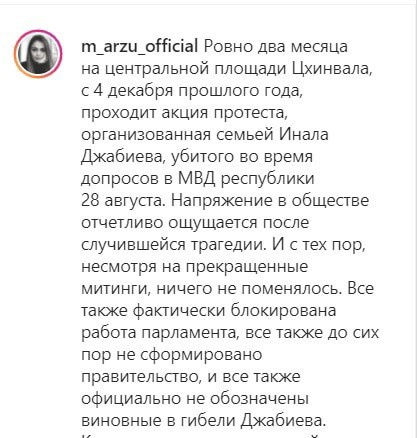 "Ровно два месяца на центральной площади Цхинвала, с 4 декабря прошлого года, проходит акция протеста, организованная семьей Инала Джабиева", - говорится в сообществе m_arzu_official в Instagram, насчитывающей 7024 подписчика.