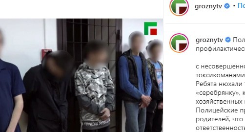 Силовики в Грозном провели беседу с подростками, занимавшимися токсикоманией, и их родителями, сообщила сегодня ЧГТРК "Грозный" на своей странице в Instagram. "Группа парней – из них один только совершеннолетний, остальным по 15 и 14 лет, казалось бы, что могут натворить эти подростки? Их задержали в нетрезвом состоянии, ребята покупали серебрянку в хозяйственных магазинах и нюхали", – сказано в видеосюжете телеканала.