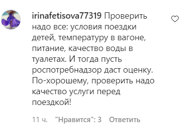 "Проверить надо все: условия поездки детей, температуру в вагоне, питание, качество воды в туалетах. И тогда пусть Роспотребнадзор даст оценку. По-хорошему, проверять надо качество услуги перед поездкой!" - написала irinafetisova77319 в сообществе krddtp в Instagram, насчитывающее 316 подписчиков. Сообщение об отравлении детей в поезде, опубликованное в паблике 7 августа, по данным на 09.30 мск сегодня, набрало 1473 отметки "нравится" и 14 комментариев.