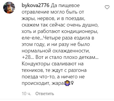 "Да пищевое отравление могло быть от жары, нервов, и в поездах... сейчас очень душно, хоть и работают кондиционеры еле-еле. Четыре раза ездила в этом году, и ни разу не было нормальной охлажденности, +28. Вот и стало плохо деткам", - высказала свою версию bykova2776.
