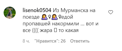 "Из Мурманска на поезде... Едой пропавшей накормили, вот и все. Жара-то какая", - написал пользователь lisenok0504, комментируя сообщение о массовом отравлении, опубликованное 7 августа в сообществе tipich_krd в соцсети Instagram, насчитывающем 483 тысячи подписчиков. По данным на 09.30 мск сегодня, под постом пользователи оставили 93 комментария и 2691 отметку "нравится".