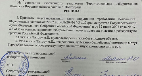 ТИК Ворошиловского района 18 сентября отказала Титову в удовлетворении жалобы в полном объеме, говорится в решении ТИК, копия которого есть в распоряжении "Кавказского узла".