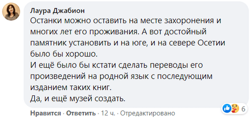 "Он родился и жил не в Осетии. Он никогда не стремился жить в Осетии. Потомкам не завещал перевести его прах. Он же не игрушка чтобы кто-то пиарился на его имени", - поддержал его osetia7777pravilnaya.