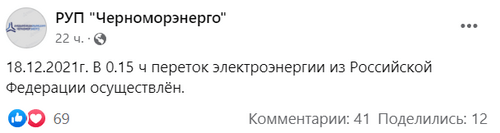 В 0.15 мск 18 декабря осуществлён переток электроэнергии из России в Абхазию, сообщило 18 декабря РУП "Черноморэнерго" на своей странице в Facebook.
