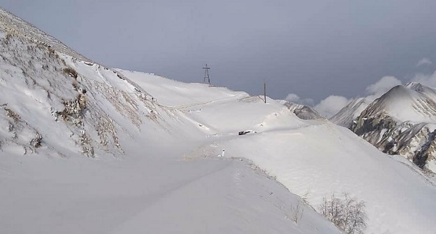 По ее данным, в связи с метелью и порывистым ветром трасса, идущая через высокогорный Харибский перевал, завалена снегом.