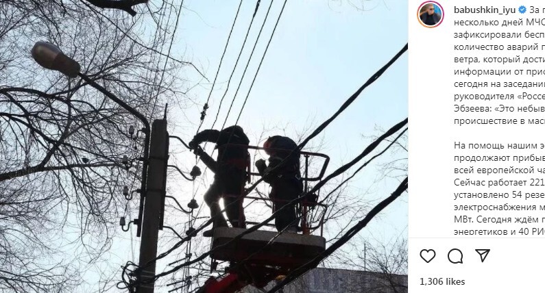 "На помощь нашим энергетикам продолжают прибывать их коллеги со всей европейской части страны. Сейчас работает 221 бригада, установлено 54 резервных источника электроснабжения мощностью 5,4 МВт. Сегодня ждём прибытия ещё 300 энергетиков и 40 РИСЭ. Дополнительные силы перенаправлены в Лиманский и Наримановский районы. Количество подключённых потребителей - 253 тысячи", - написал 8 марта на своей странице в Instagram Бабушкин.