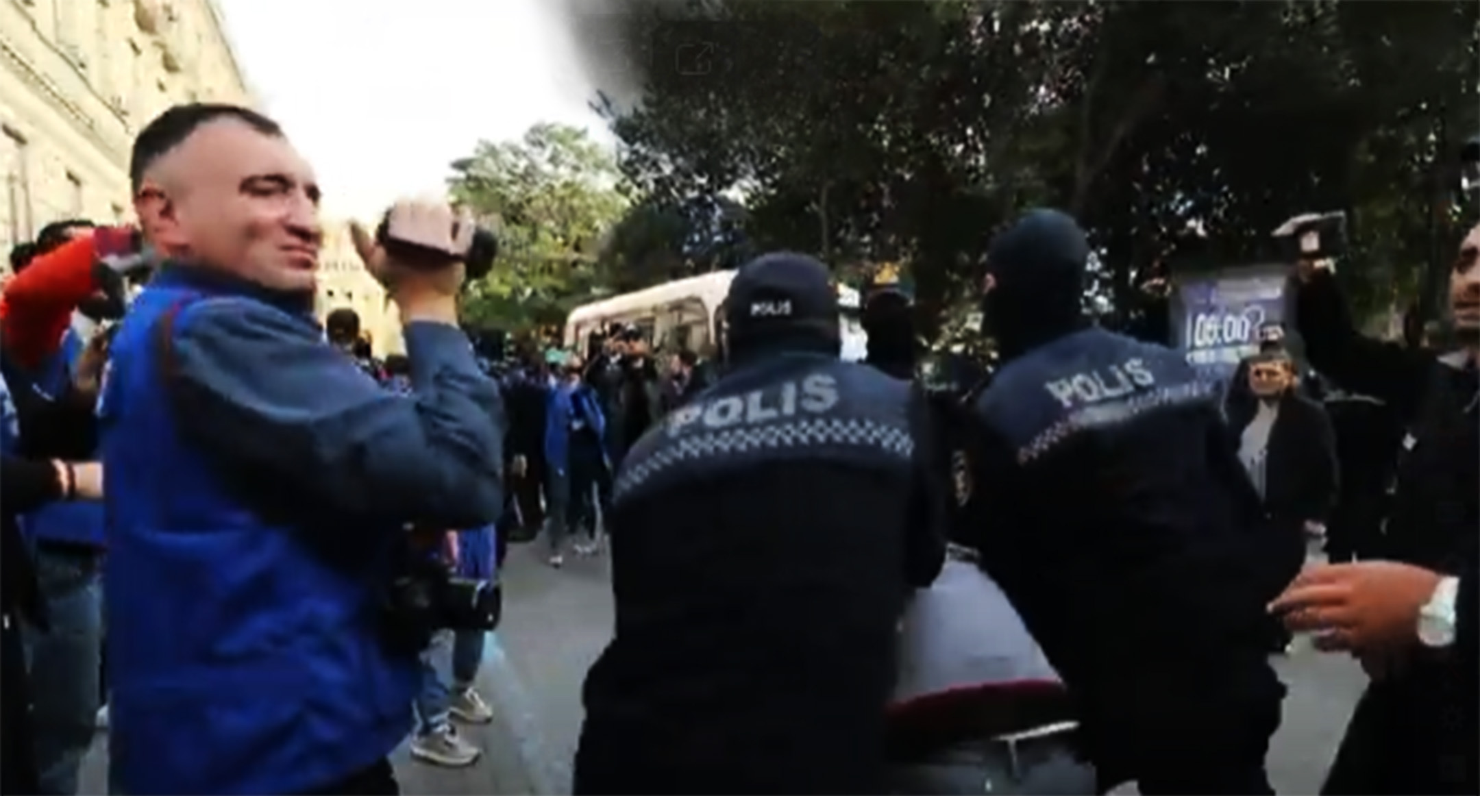 Кроме того, полиция взяла под наблюдение площадку перед расположенной рядом с мэрией станцией метро «Ичери шехер». На узкой улице, примыкающей к городской администрации, стояли два спецавтобуса с зарешеченными окнами и десяток полицейских машин.