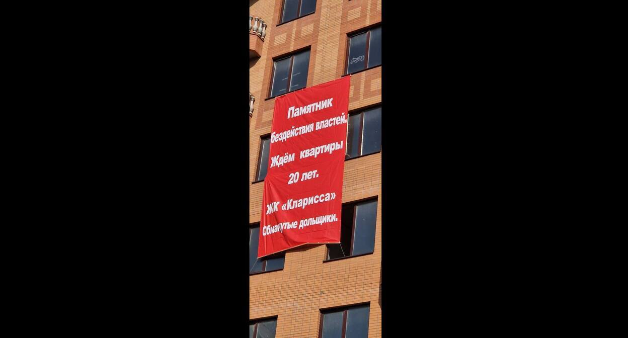 Как писал "Кавказский узел", в сентябре дольщики, которые почти 20 лет не могут добиться окончания строительства ЖК "Кларисса" в Краснодаре, провели серию одиночных пикетов у здания администрации Краснодарского края. Ранее, 27 августа, на одном из зданий ЖК "Кларисса" дольщики разместили баннер и назвали его "Памятником бездействия властей".