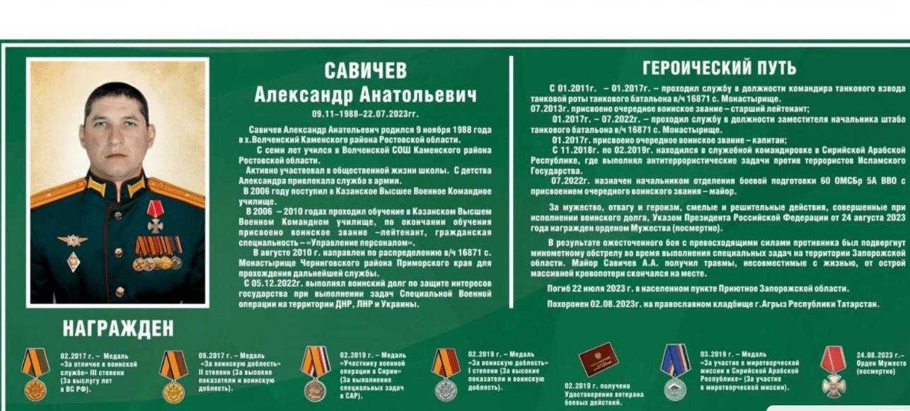 Майор Александр Савичев убит в военной операции на Украине 22 июля 2023 года. Окончил Казанское Высшее Командное училище. Служил в Сирии, с декабря 2022 года принимал участие в специальной военной операции, сообщила сегодня администрация Каменского района в своем Telegram-канале. Как следует из фотографии "Парты героя", фотография которой приложена к публикации, ему было 36 лет.