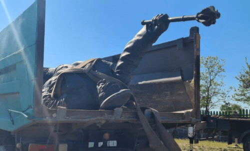К сообщению приложены фотографии, на которых видно, как памятник снимают с постамента, а также лежащую в кузове грузовика скульптуру