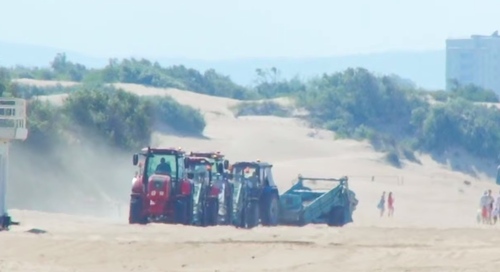 Публикация проиллюстрирована видеороликом, на котором видна спецтехника, работающая на песчаном пляже. На этом же пляже, неподалеку от работающих машин, видны группы гуляющих людей, в том числе с детьми, и множество отдыхающих на берегу.