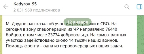 "М. Даудов рассказал об участии республики в СВО. На сегодня в зону спецоперации из ЧР направлено 76440 бойцов, в том числе 23774 добровольца. На самых важных участках задействовано около 14 тысяч наших воинов", - говорится в текстовом сообщении.