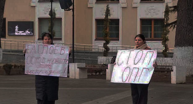 Как следует из фото, которые опубликовал Telegram-канал "Бонварнон", на центральную площадь города вышли две женщины с плакатами: "Гаглоев, остановите этот беспредел!" и "СТОП ОПГ".