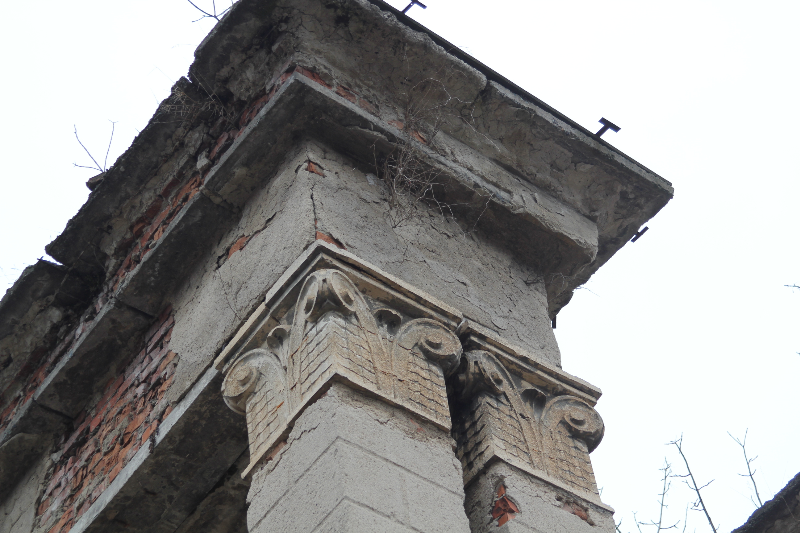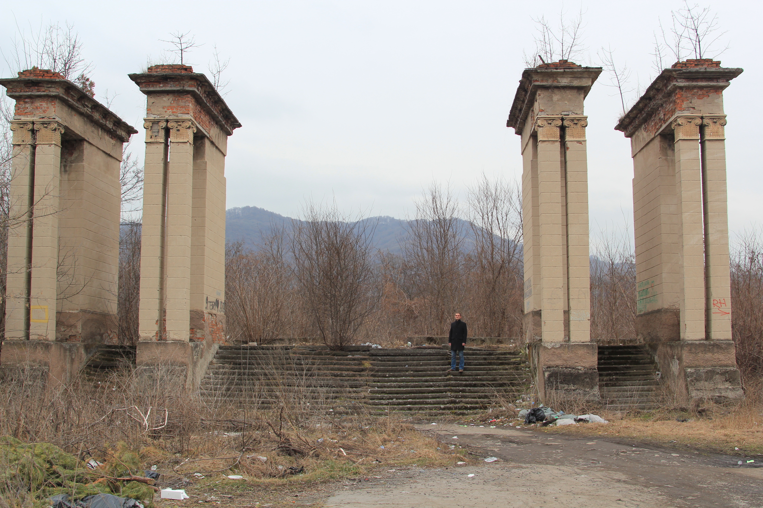 ну и несколько фотографий того, в каком состоянии сейчас находится "летний театр". в принципе, от него остался только этот вход, все остальное поросло лесом, сквозь который с трудом угадываются фрагменты трибуны и сцены.
