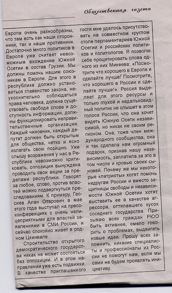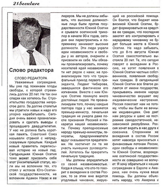 Газета "XXI век" это сейчас единственое независимое издание в Южной Осетии. Выходит не регулярно, качество низкое, но всегда содержит интересные материалы. Сайта, конечно, пока нет и потому предлагаю из свежего номера колонку редактора, Тимура Цховребова. Надеюсь, что качество годное для чтения. АЦ2