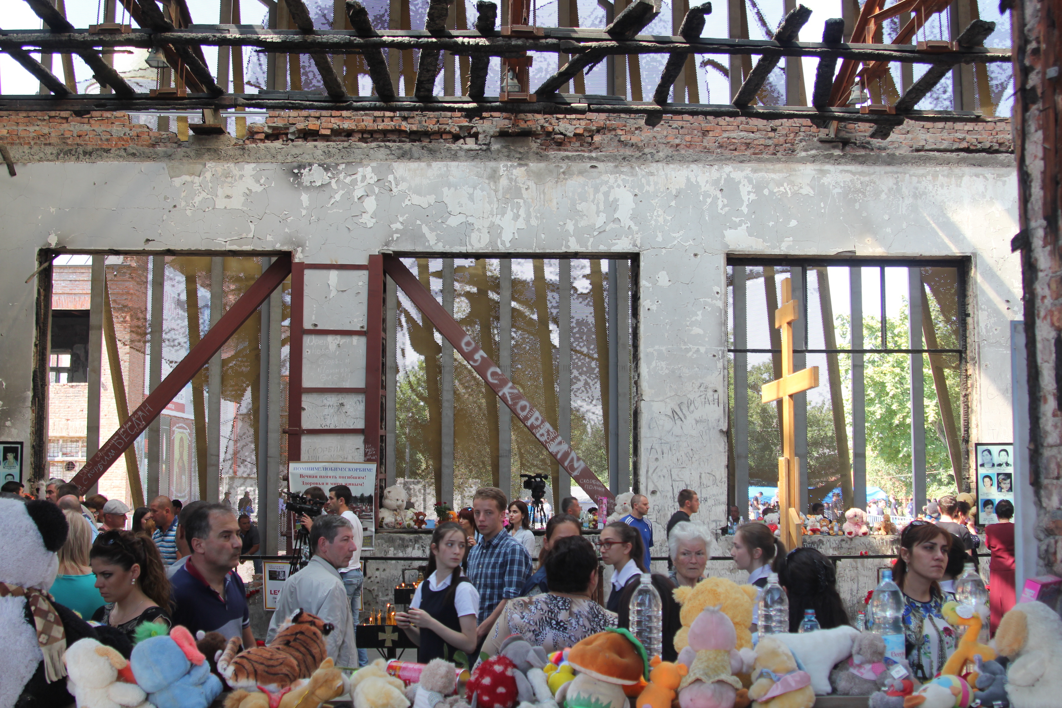 несколько фотографий с сегодняшних траурных мероприятий и короткое видео с минуты молчания в 13:02 - времени первого взрыва в спортзале школы.