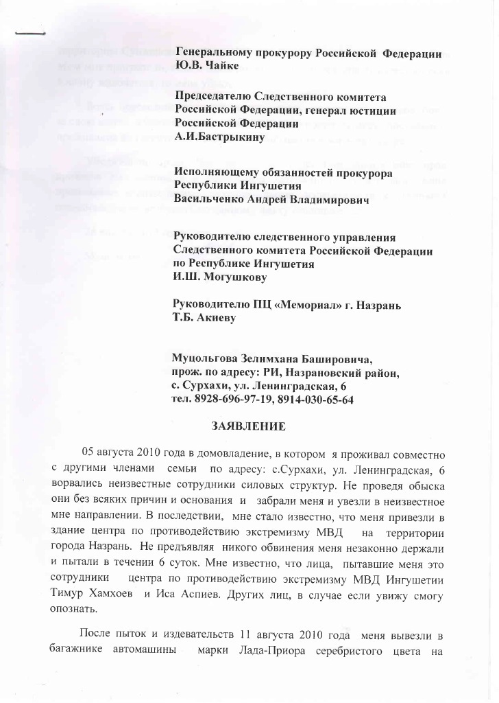 18 декабря 2003 года, прямо около своего дома в г. Карабулак, был похищен мой младший брат Башир. По факту его похищения было возбуждено уголовное дело, но дальше этого, следствие не пошло, за все эти годы оно не продвинулось не на шаг. С того злополучного дня, прошло уже ровно 13 лет. Как и по сотням других аналогичных уголовных дел, на сегодняшний день, следствие приостановлено, в связи с невозможностью установить личности похитителей и это несмотря на множество улик в материалах дела, а так же вступившее в силу решение ЕСПЧ. В материалах уголовного дела есть множество доказательств, подтверждающих причастность к похищению моего брата сотрудников спецслужб, между прочим, в том числе и фоторобот руководившего похищением человека. Как я уже писал, отношение следствия к самому факту похищения и расследованию уголовного дела, объясняется хотя бы тем, что сфотографировать место преступление, следственные органы решили спустя 5 лет после похищения моего брата, да и приехавший для этого человек, не имел никакого отношения к следствию, это был водитель городской прокуратуры.