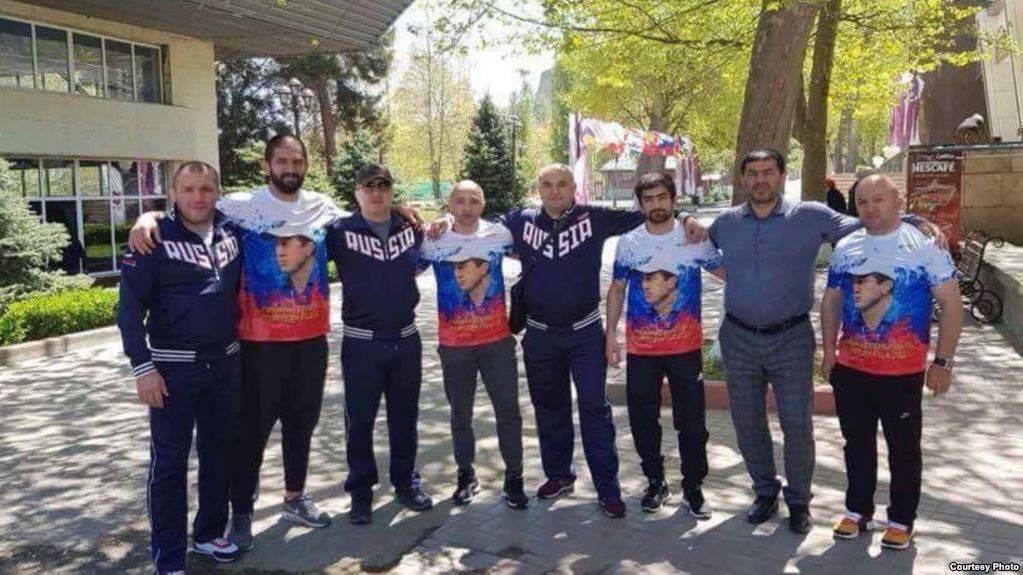 На всех спортсменах надеты футболки цветов российского триколора. Более того, на майках присутствует изображение главного тренера сборной РФ по вольной борьбе и депутата парламента Северной Осетии Дзамболата Тедеева. На снимке рядом с грузинскими борцами стоят члены российской сборной, а также их тренеры.