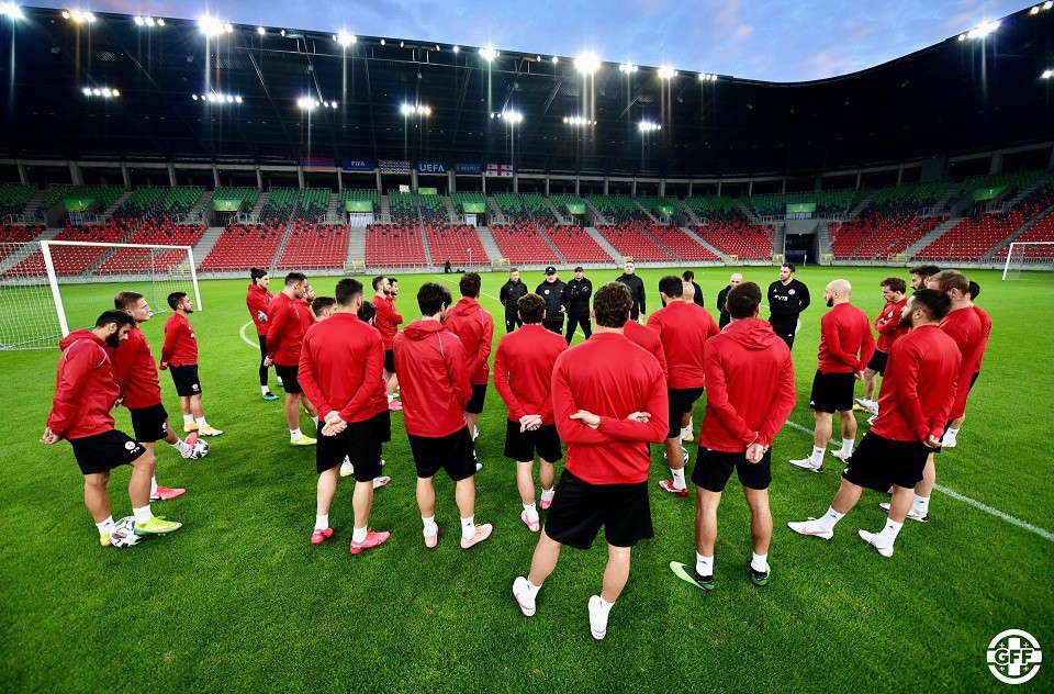 Источник: https://1tv.ge/ru/news/pervyj-kanal-predlozhit-zriteljam-transljaciju-matcha-armenija-gruzija/ Сборная Грузии готовится к матчу с Арменией.