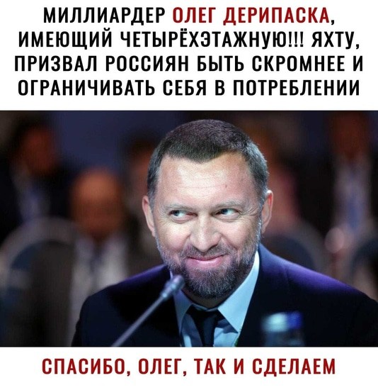 Не самая свежее, но по-прежнему достаточно актуальное - от российского миллиардера Дерипаски, призвавшего россиян быть скромнее в потреблении.