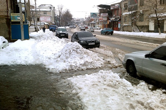А вот так выглядит самая чистая улица Махачкалы - Гаджиева. Снег просто спихнули на тротуар. Пешеходы протоптали дорожку. В некоторых местах ширина это дорожки - сантиметров 30.