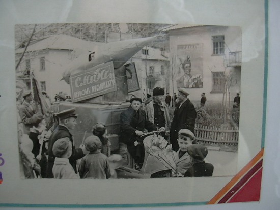 Историческую, можно сказать, фотографию недавно увидел в одной из школ - "чествование Гагарина" во время первомайской демонстрации 1961-го года в Тырныаузе. Но поскольку она на стенде под стеклом, а фотограф из меня никудышний, никак не получалось приемлемо заснять, попыток 10 сделал... Потом вообще стенд снял на глазах у учителей, дал им в руки и повернул от окна лицом (попросил, разумеется, максимально вежливо - не отказали), но всё равно какие-то блики получились...