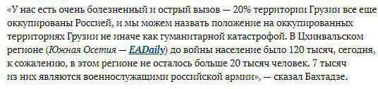 Да и сама фраза про население Южной Осетии, свидетельствует что Южной Осетии а соответсвтено осетин как национальности даже как сообщества, в Грузии, в Грузии, видеть не хотят. Цхинвалорегионцы - вот такая национальность их больше утстраивает. Бахтадзе говорит "до войны" но не уточняет до какой. Их было три по крайней мере, а на конференции о цифрах, надо соблюдать нумерацию.