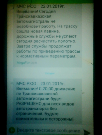Сегодня, в 20.04 получил столь ожидаемую СМС от МЧС,  о том, что движение по Транскавказской автомагистрали будет РАЗРЕШЕНО для всех видов транспорта. При чем,  до скольки часов завтрашнего дня, это будет продолжаться, указано не было. Неужто, снежная блокада в этом году закончилась. Ну, хотя б в этом месяце. Ведь не январь, а февраль и начало марта, как правило, считается наиболее лавиноопасными. И хотя издание "Взгляд",  считает что Южная Осетия попала в уникальную природную западню, одно уникальное явление не исключает другого – обычно повторяющегося из года в год