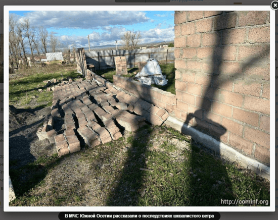 Но слава всевышнему, что все обошлось у нас без человеческих жертв, а только несколькими крышами, которые конечно же восстановят до ближайшего дождика. Как сообщили в МЧС, ветром снесло кровлю многоквартирного дома на улице Исака Харебова в Цхинвале и часть крыши частного дома в селе Прис, в районе Фаллаг Фарс из-за сильного ветра оторвался забор. Но, судя по фотографии, забор завалило скорее, чем оторвало, в силу того, что был он блочным.