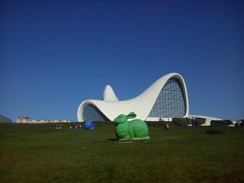 Зайцы и улитки у Центра - это интересная история. Говорят, что на лужайке перед центром проводилась международная выставка современных скульптур. Иностранный автор решил не забирать с собой эти творения, может, транспортировка стоила дорого, и оставил здесь. С тех пор зайцы и улитки стали очаровательным дополнением к Центру Г.Алиева