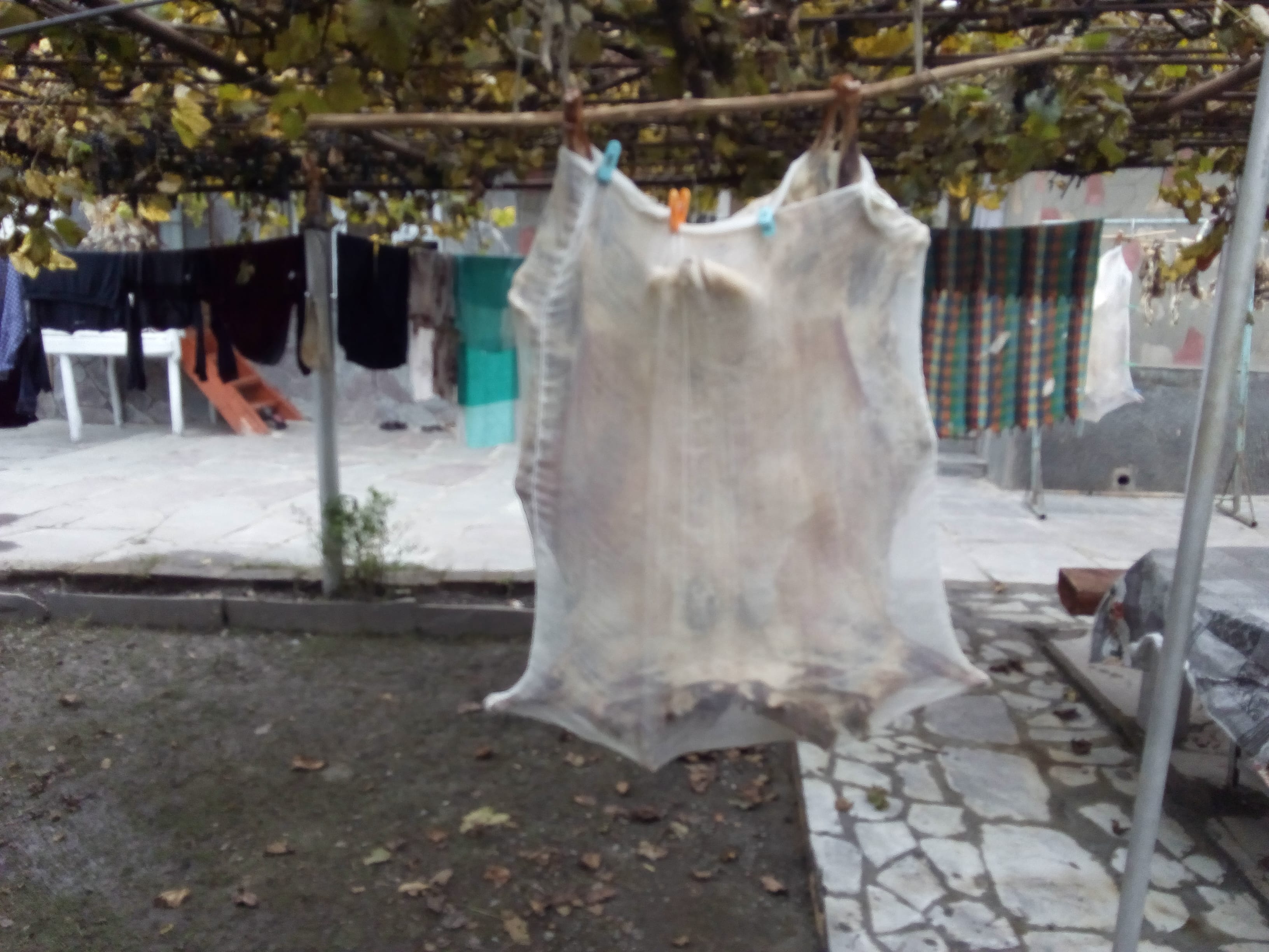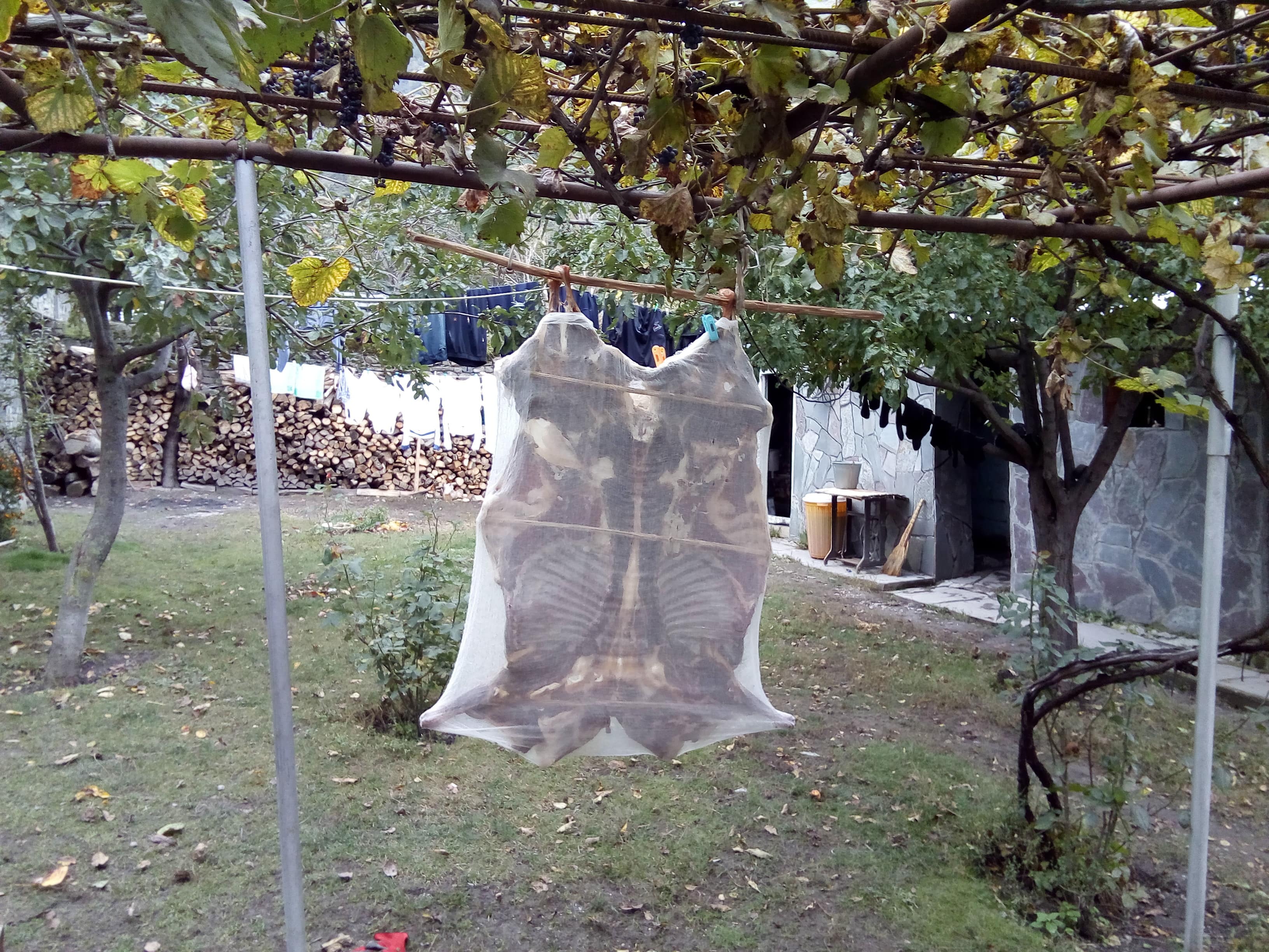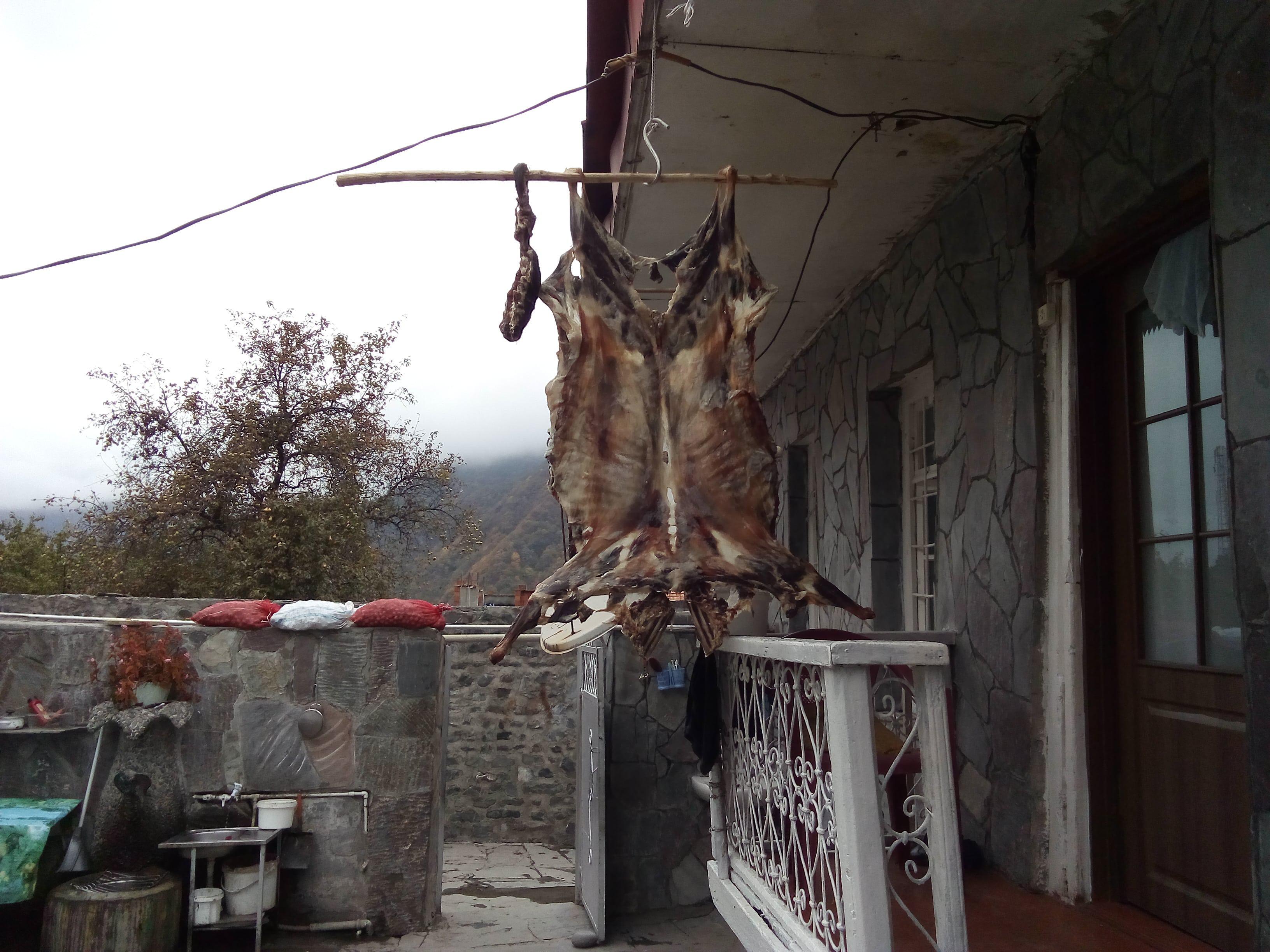 Если еще не поняли то следующий снимок подскажет. Так в горах сушат мясо на зиму. Когда от холода исчезают мухи, вешают туши растянутые на палках, иногда покрывают марлей, чтобы не загрязнялась. За месяц мясо высыхает, дегидратизируется. Зимой остается отрезать кусок, кинуть в кипящую воду и получается не свежое, но вкусное мясо с запашком. Те кто пробовал потом ищут всю жизнь, где бы откушать еще. Продается дороже свежего мяса.