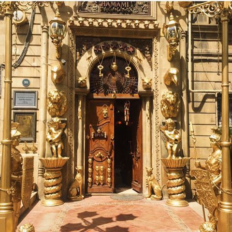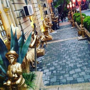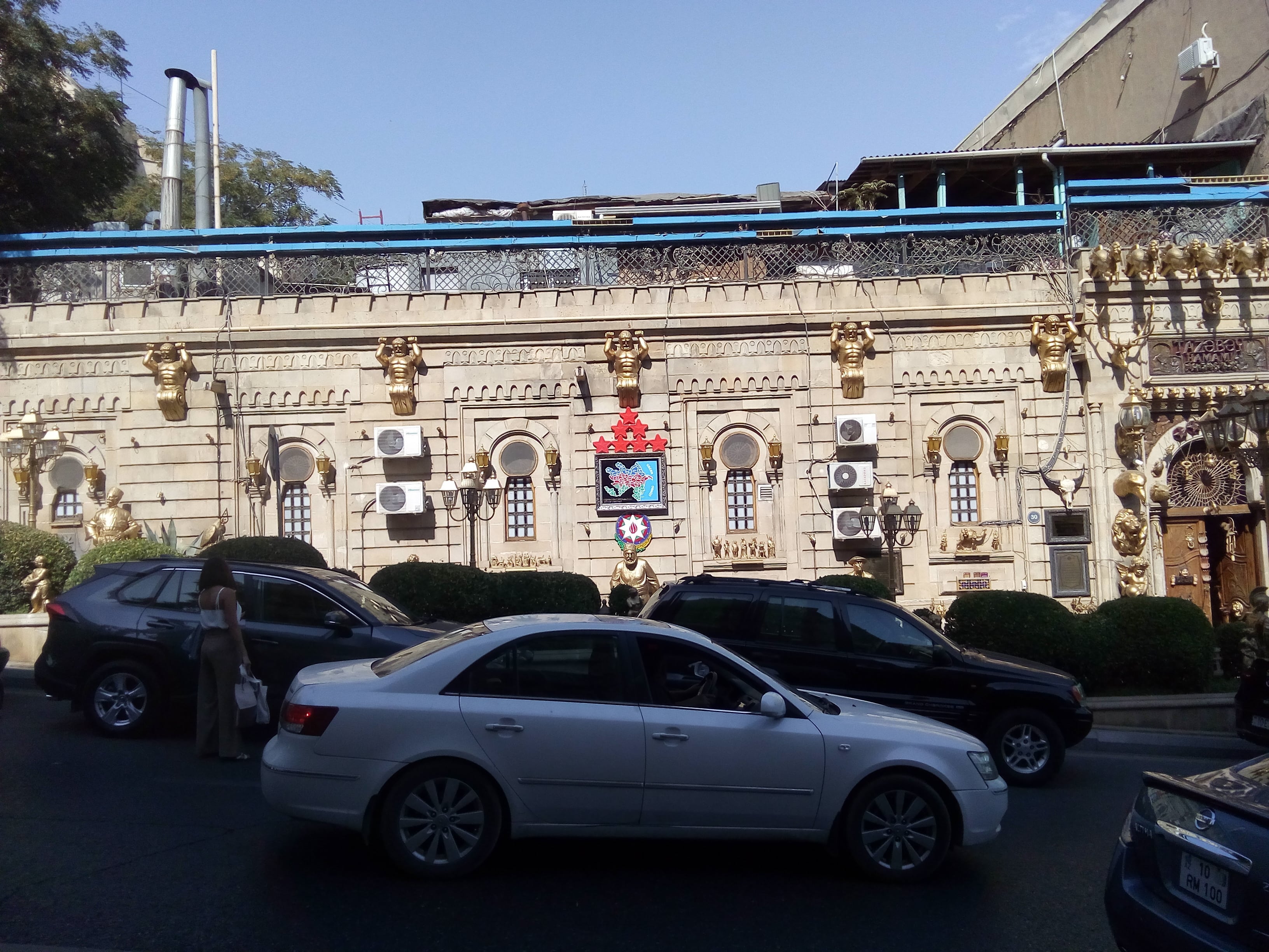 Тихий, ненавязчивый и своебразный юмор наполняет весь Баку. Фотографировал вход в мечеть Тезебей (то есть "жених"). Владелец обожает кич, то есть пародию на искусство, и облепил все старое здание покрашеными в позолоту глупыми скульптурами писающих мальчиков, суровых индейцев и персонажей из бакинских оперетт. А заведению сам присвоил уровень семь здезды. Захотел и присвоил, кто ему запретит?