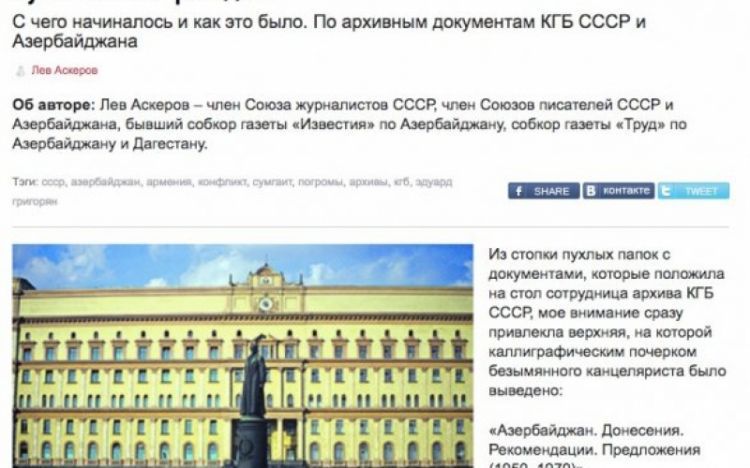 «В преддверии годовщины Сумгаитских событий 1988 года обозреватель Лев Мабудович Аскеров в российской «Независимой газете" опубликовал статью «Сумгаитская трагедия". С чего начиналось и как это было" по архивным документам КГБ СССР и Азербайджана. В данной публикации автор ссылался только на архивные документы и свидетельства очевидцев, в которых говорилось, что сумгаитские события явились результатом заранее подготовленной крупной провокации армянских националистов и армянского лобби в советских спецслужбах», - говорится в обращении.