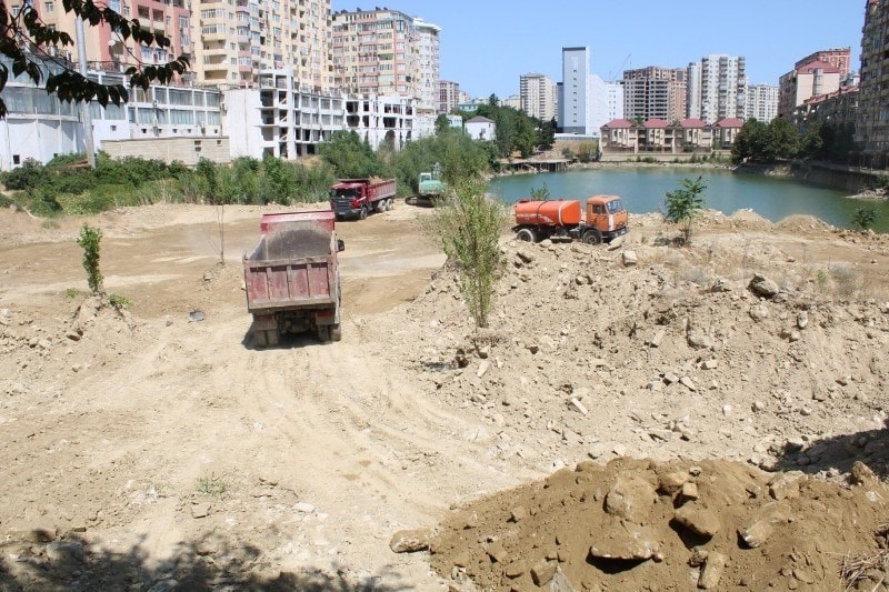 С июля этого года неизвестные нувориши взялись осваивать последнее ясамальское озерце, скорее даже пруд у подножия жилого квартала «Три короны». Начали его засыпать, понятно зачем — чтобы воткнуть туда 16-этажки и продавать по 1200 манат за кв м.