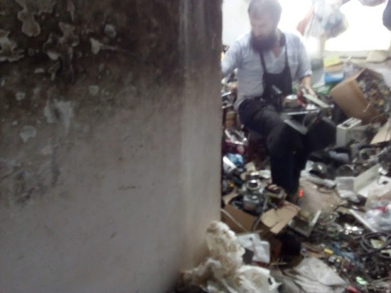 А иллюстрацией этого поста я поставлю снятую мной в позапрошлом месяце фотографию мастера-электротехника в Сумгайыте. Фотографировал тайком, поэтому качество плохое. Меня привели к нему, посоветовав отдать сгоревший стабилизатор. Был удивлен увидев, что мастер сидит на табурете, в центре комнаты буквально весь пол которoй завален старыми запчастями, платами, проводами. Перед мастером нет удобного в такой работе стола с лампой над головой и подставкой для паяльника. Нет, этот человек ремонтировал бытовой прибор, держа в руке паяльник, другой рукой и коленом прижимая к себе неисправное устройство, Все это на весу, прижимая к подбородку. И у него получалось!