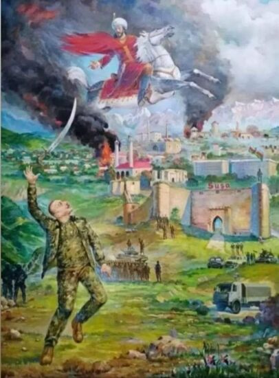 Смотрел иронические комментарии по поводу этой картины, нарисованной художником-любителем и размещенной в интернете. На картине изображен то ли Шах Исмаил Хатаи, то ли шах Надир, один из них с небес кидает победный меч президенту И.Алиеву. Как бы происходит передача эстафеты побед из средних веков в современность. Комментаторы называют безвезстного автора подхалимом и идиотом.