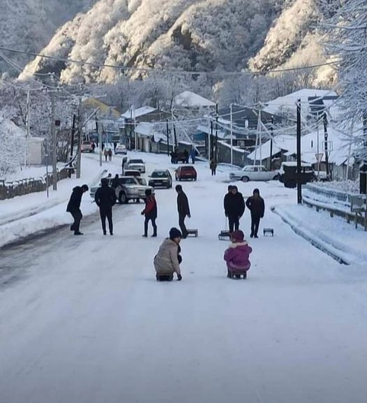 А в селе Илису, на расстоянии десятка километров пешего хода до Дагестана, выпавший вчера снег сохранится больше. Там дети даже катаются с высоты на деревянных санках, они называют санки "татра"