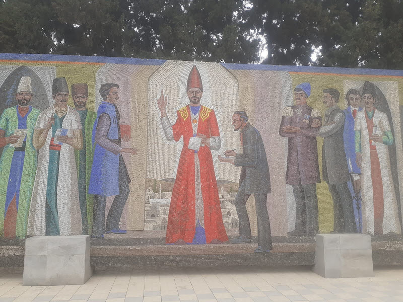 Только в Гяндже со времен СССР до сегодняшнего дня мог безбедно простоять на красочном большом мозаичном панно классик армянской поэзии Хачатур Абовян (второй справа). Я бы не верил в такое, но гянджинец Орхан Исмаилов прислал мне фотографию. Х.Абовян изображен в компании с другими классиками разных народов, они пришли к Мирза Шафех Вазефу