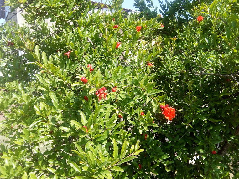 Это цветы граната, у меня на даче его много, прошлогодний гранат в холодильнике еще не сьели, годится как приправа к многим блюдам