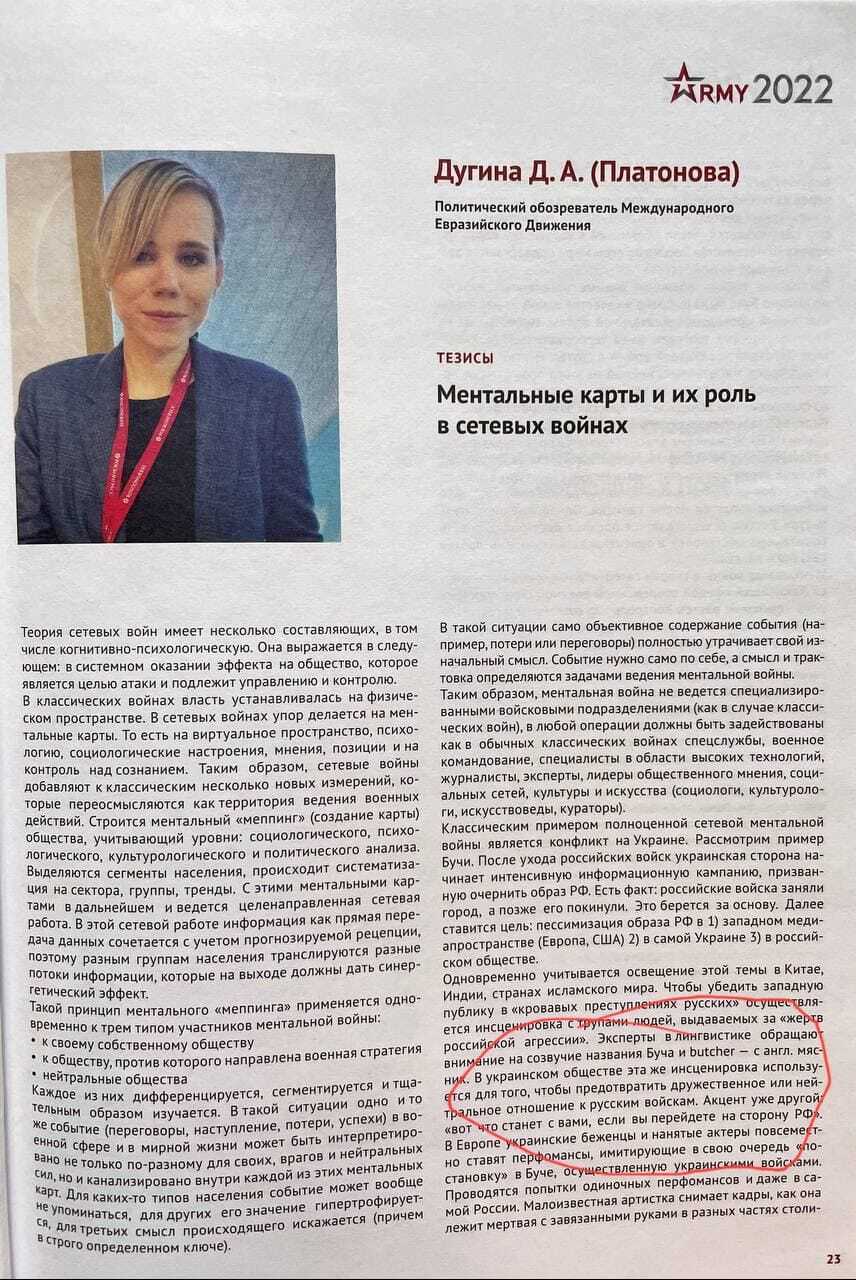 Моя позиция: Дугина-Платонова была, параллельно с отцом, идеологом воинствующего "Русского мира", который шесть месяцев показывает все у него имеющееся в Украине. Она - воитель, вдохновитель бойцов, непрямой участник действий, и поэтому попадает в список целей сопротивляющейся стороны. Если бы Дугина специализировалась на искусстве, тогда не было бы и речи, мы бы сказали, что погибла напрасно, сев в автомобиль предназначенный для Дугина-старшего. Но она сама была пропагандистом происходящего в России и Украине, поэтому оценка теракта становится другой.