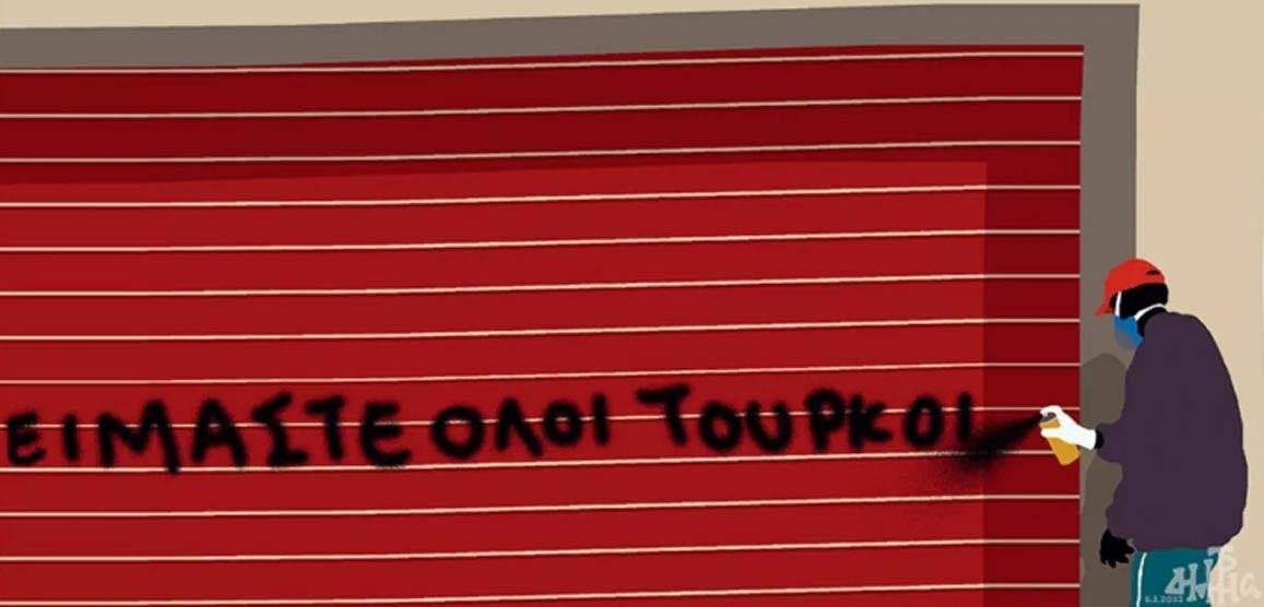 Отвечая на мерзость от французской "Шарли Эбдо" в греческой газете поместили свой рисунок: грек пишет на стене "все мы турки".