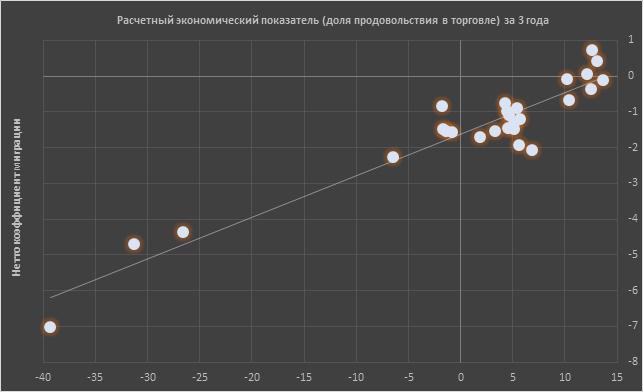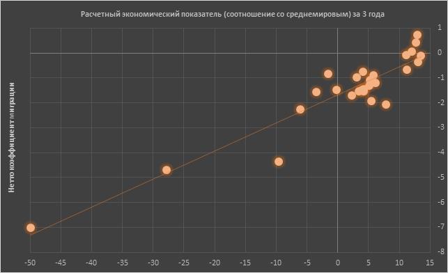 Пока же рассмотрим точечную диаграмму, где видна зависимость миграционной динамики от рассчитанного нами экономического показателя. Почти все точки находятся очень близко к линии тренда.