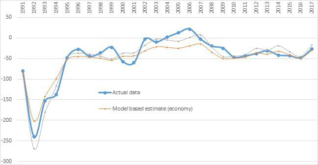 Модель, основанная на экономической динамике (представленная в этом посте) предсказала -30,240 человек, в реальности сальдо пассажиропотока -26,900 в 2017 году, а в 2016 году она предсказала -48,780 человек, а в реальности было -48,170 человек. В 2015 году разница была чуть больше - ожидаемое -41,510, реальное -43,440.