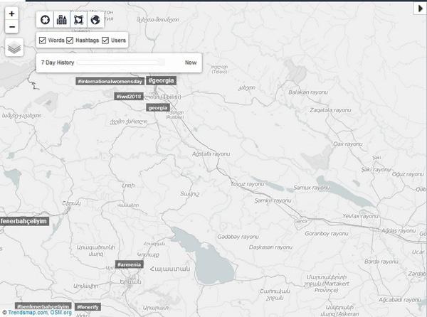 К сожалению, по Армении этих хэштегов бывает слишком мало, поскольку мало юзеров и интереса к этой социальной сети. К примеру, в Турции, где твиттер, также как и фейсбук, очень популярен, это более актуально. Тем не менее, если что-то важное происходит, оно обязательно будет на карте. Кроме того, можно смотреть на ситуацию в других странах и регионах.