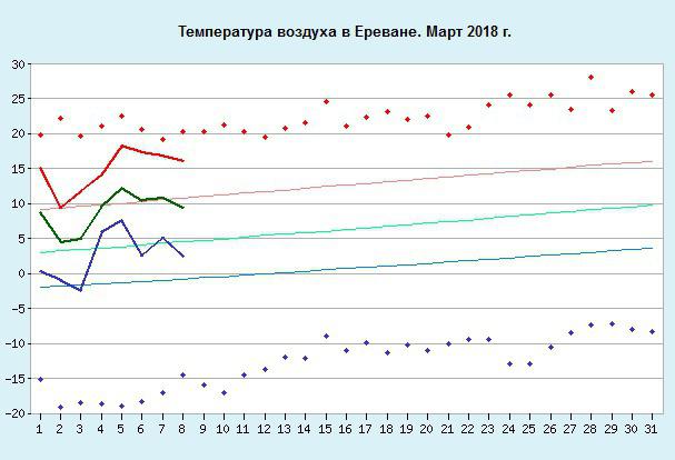 Климатический монитор Еревана находится по адресу: http://www.pogodaiklimat.ru/monitor.php?id=37788 (подставив код другого города, можно найти и данные по этому городу). Кроме того, существует страница текущей погоды в Ереване: www.pogodaiklimat.ru/current/37788.htm (обновляется раз в несколько часов) и архив погоды в Ереване: http://www.pogodaiklimat.ru/weather.php?id=37788 (обновляется раз в три часа и включает в себя как погоду, так и ощущения по погоде, осадки, температуру и многое другое).