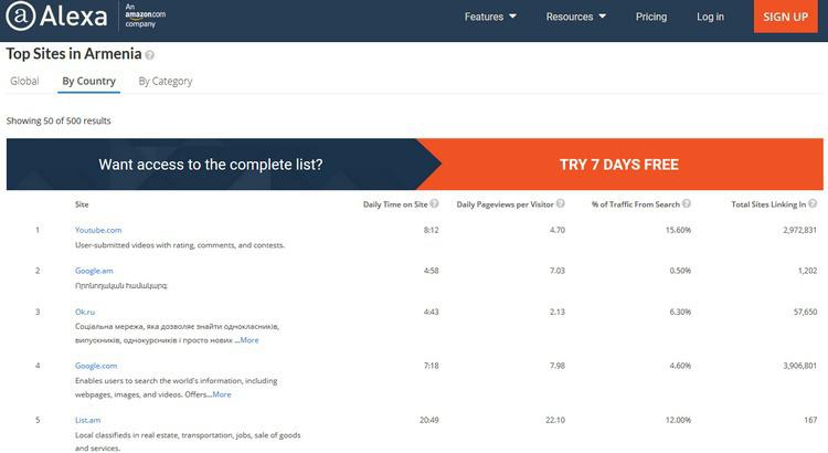 Перейдем от географии к более практической информации. На сайте alexa.com можно увидеть самые посещаемые вебсайты из каждой страны. По Армении бесплатно предоставляется первые 50 страниц, правда там есть повторы вроде google.am и google.ru. Тем не менее, это очень интересно, особенно учитывая то, что там есть и новостные сайты. Список посещаемых сайтов можно увидеть здесь: https://www.alexa.com/topsites/countries/AM