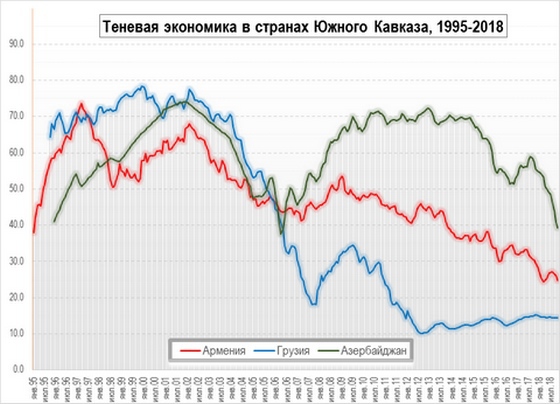 Кстати, довольно заметная синхронность присутствует в динамике теневой экономики стран Южного Кавказа, в особенности у Армении с Грузией, а также, пусть и в меньшей степени, у Армении с Азербайджаном, но ее нет у Грузии с Азербайджаном.