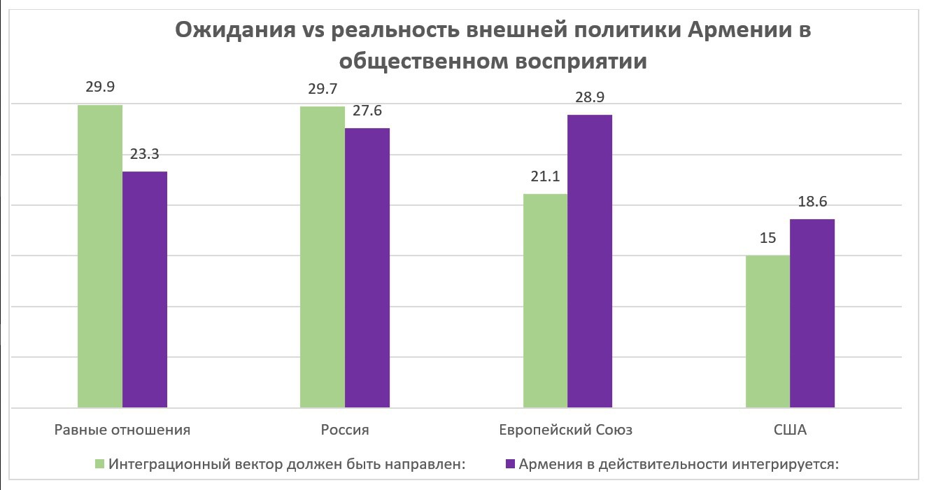 Однако, возможно, за изменением оценок стоит также и то, что изменились подходы политического руководства Армении. Хотя эти изменения не являются принципиальными, они, тем не менее, ощущаются обществом. Например, недавно MPG/Gallup провел опрос, согласно которому запрос на интеграцию с Россией выше, чем восприятие соответственной политики. С Западом – наоборот.