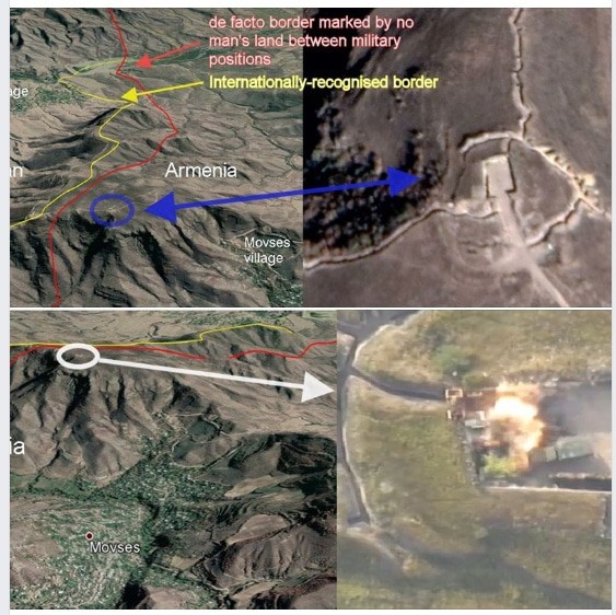 На этом фоне происходят столкновения и в других районах армяно-азербайджанской границы, в частности в Нахичеване. Азербайджанская сторона начала усиливать нажим, начала артиллерийский обстрел, подключила ударные беспилотники, обстреляла армянский командный пункт и распространила видео о взрыве, снятом с БПЛА. Вот его местоположение и кадры обстрела (источник – NK Observer).