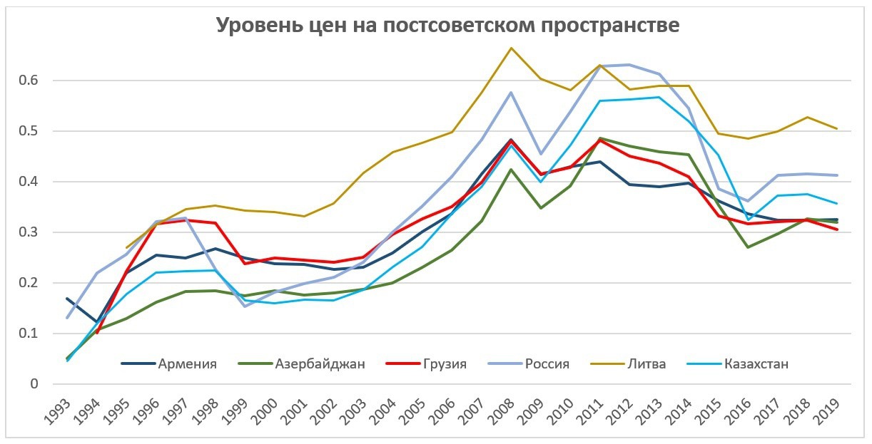 Во многом это сокращение происходит благодаря торможению лидеров в период после 2014 года, что очень сильно сказалось и на России, и на Беларуси (хотя в той или иной степени были затронуты все страны кроме прибалтийских). Армения к 2019 году отставала от Азербайджана на 38% по ВВП на душу населения (исходя из оценки азербайджанского населения в 6.2 млн), хотя это отставание почти полностью вызвано большим нефтегазовым сектором экономики Азербайджана. По потреблению страны практически равны: 12.7 тыс. в Армении и 13.8 тыс. в Азербайджане (разрыв 8%). Что же касается Грузии, то по официальным данным ее население составляет 3,723 тыс. чел., но в реальности численность населения в 2019 году была примерно на 240 тыс. чел. больше, что образовалось из-за ошибок при переписи населения 2014 года. Но поскольку это расхождение постепенно сокращается, к следующей переписи оно будет уже не более 100 тысяч человек.